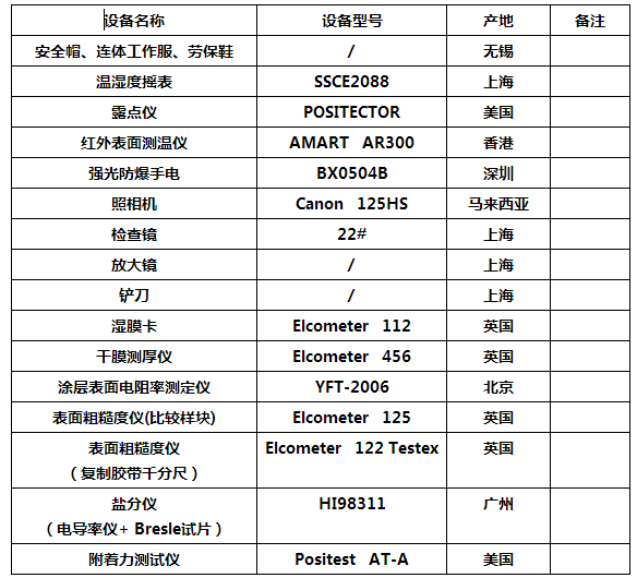 廈門(mén)雙瑞船舶涂料有限公司為滿(mǎn)足船舶及工業(yè)重防腐涂料行業(yè)發(fā)展的需求,組建了一支基礎知識扎實(shí)、涂裝現場(chǎng)經(jīng)驗豐富的技術(shù)服務(wù)隊伍。這些人100%持有涂裝檢查員證書(shū),包括NACE涂裝檢查員證書(shū)、CCMCIC涂層檢查員證書(shū)??蔀楦黝?lèi)船舶、海洋工程、橋梁、管道、電廠(chǎng)、石油石化等重防腐領(lǐng)域客戶(hù)提供了專(zhuān)業(yè)、周到的涂裝技術(shù)服務(wù)和監理工作。 在產(chǎn)品的使用現場(chǎng),從雙瑞涂料產(chǎn)品的使用開(kāi)始,提供全流程的現場(chǎng)服務(wù),保持與業(yè)主和承包商的溝通,對現場(chǎng)的涂裝環(huán)境、涂裝前的表面處理等級的、涂料的使用等關(guān)鍵環(huán)節進(jìn)行控制,指導施工部門(mén)進(jìn)行正確的涂料施工,為業(yè)主獲得高質(zhì)量的涂層、承包商獲得高效的涂裝提供有效保障。 表1 現場(chǎng)技術(shù)服務(wù)裝備情況